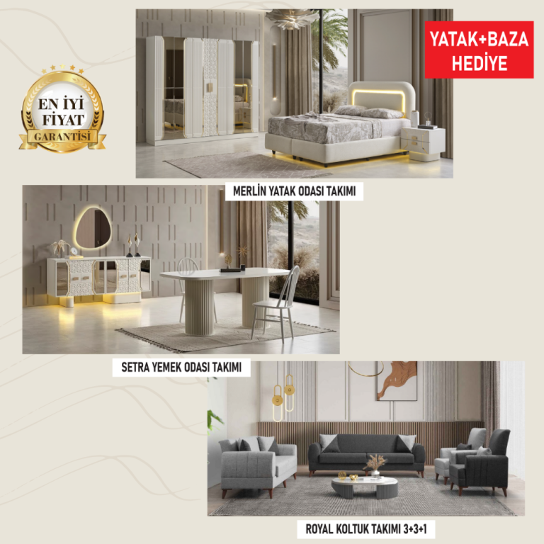 ATILIM Merlin & Setra & Royal Full Düğün Paketi – Yatak Odası, Yemek Odası ve 3+3+1 Koltuk Takımı (Yatak + Baza Hediyeli)