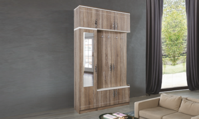 Çocuklar Duymasın Portmanto – Ahşap Desenli, Çok Bölmeli, Aynalı ve Ayakkabılıklı, Fonksiyonel Vestiyer