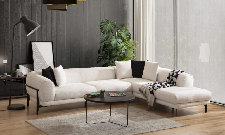 Pamir Koltuk Takımı 3+3+1 – Yuvarlak Hatlı Boucle Kumaş, Kontrast Biye Detaylı, Yüksek Ayaklı, Yataklı