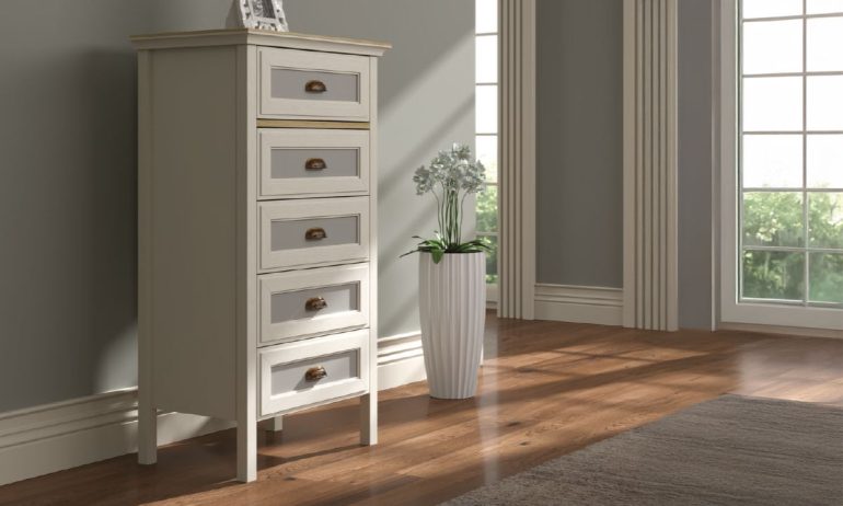 Misto Şifonyer – 5 Çekmeceli, Country Tarzı, Ahşap Tablalı, Beyaz/Gri