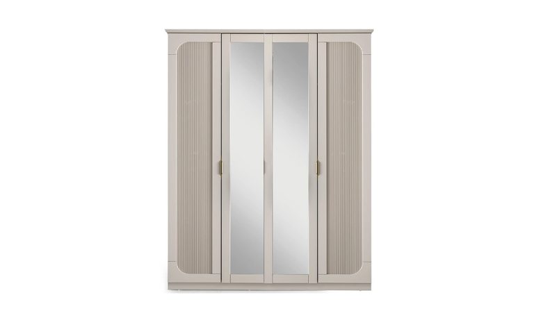 Kanyon 4 Kapılı Aynalı Gardırop – Dikey Oluklu Tasarım, Bol Raflı ve Askılıklı, Açık Gri/Bej