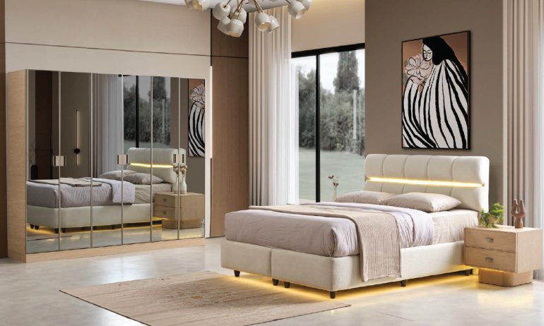 MDF Sofia Yatak Odası Takımı Bazalı | Lüks Yumuşak Başlık, Aynalı Gardırop ve Özel Komodin Tasarımı