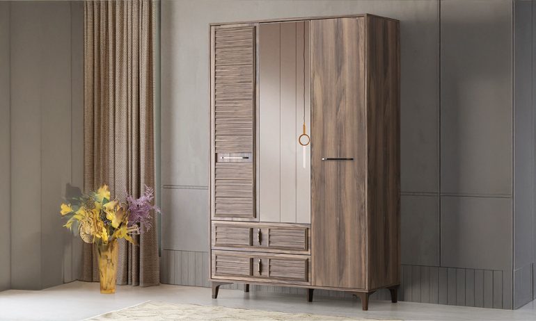 Moi 3 Kapılı Aynalı Gardırop – Panjur/Jaluzi Kapak Detaylı, 2 Çekmeceli, Rustik Ceviz Desenli Yatak Odası Dolabı