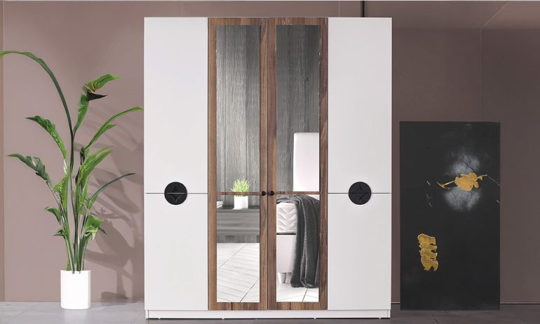 Soft 4 Kapılı Gardırop – Aynalı, Bol Raflı, Beyaz ve Ceviz Detaylı, 2 Çekmeceli