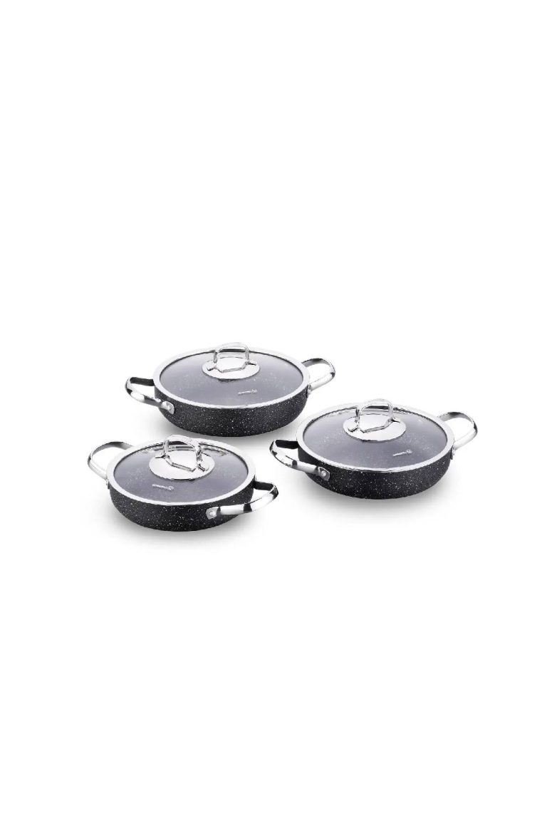 Korkmaz A1545 Galaksi 6 Parça Omlet Seti – Volkanik Görünümlü PTFE Kaplama, Üstün Yapışmazlık Özellikli, Isıya Dayanıklı Cam Kapaklı ve Metal Saplı Sahan Seti