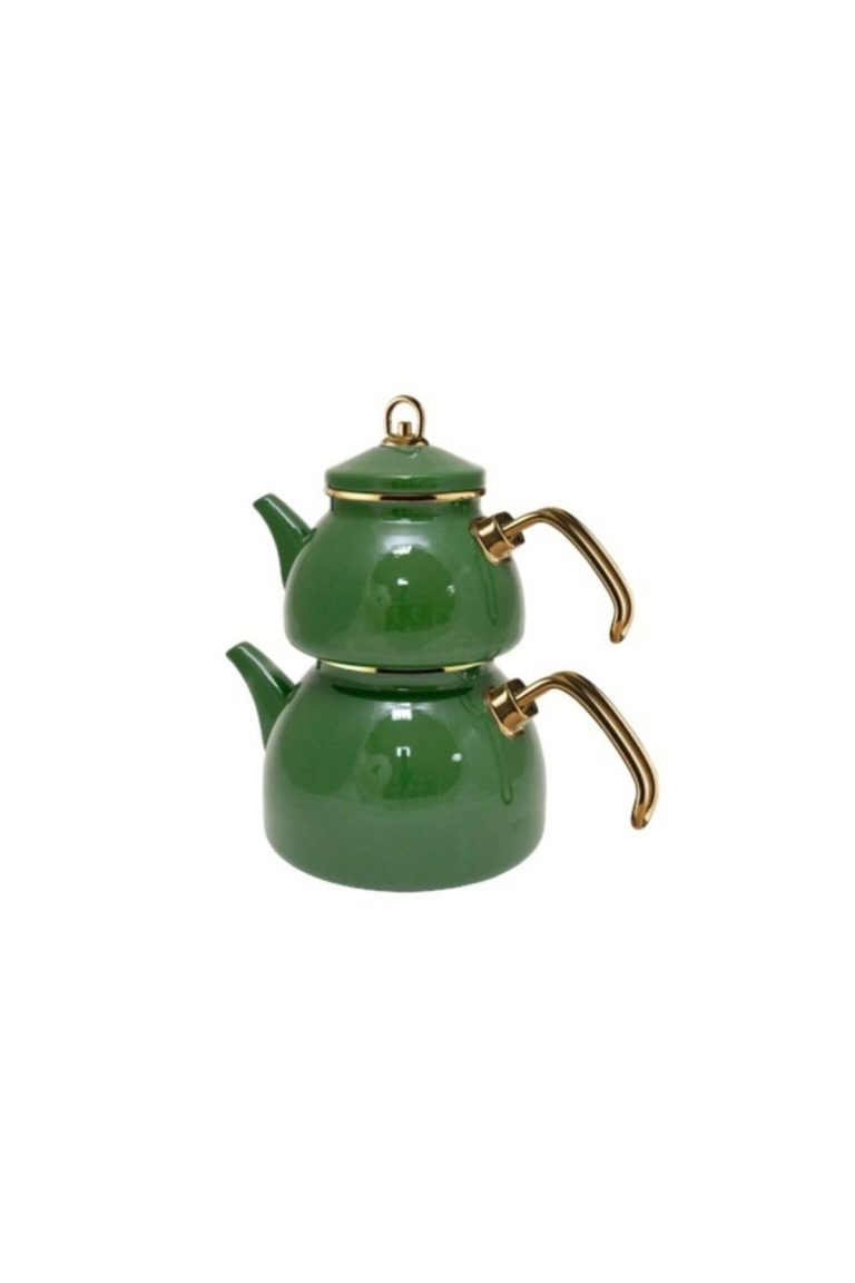 LUX Serisi Yeşil Emaye Çaydanlık Takımı | Altın Rengi Ergonomik Saplı