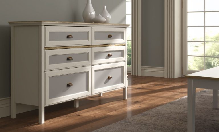 Misto Yatay Şifonyer – 6 Çekmeceli, Country Tarzı, Ahşap Tablalı, Beyaz/Gri
