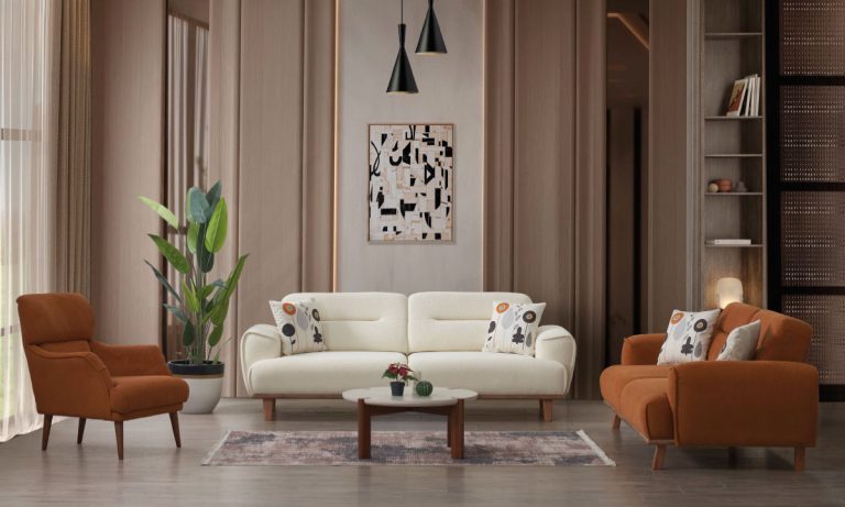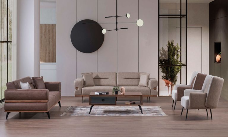 Eliza Koltuk Takımı 3+3+1 – Kollarda Entegre Ahşap Tepsi Detaylı, Yüksek Ayaklı, Yataklı Modern Set