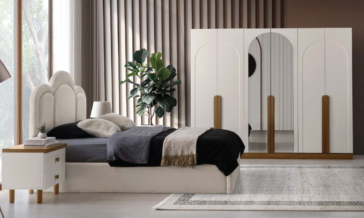 Kemer Formlu ve Aynalı Gardırop: Takımın geniş ve altı kapaklı gardırobu, kapaklarının üst kısmındaki zarif kemer (yarım daire) formu ile modern bir mimari çizgiye sahiptir. Orta kapaklarda yer alan geniş boy aynaları, odaya derinlik katarken, kemerli kapaklardaki uzun, ahşap görünümlü kavisli kulplar modern ve doğal bir dokunuş ekler. Gardırobun altındaki ahşap süpürgelik, takıma sıcak bir temel oluşturur.