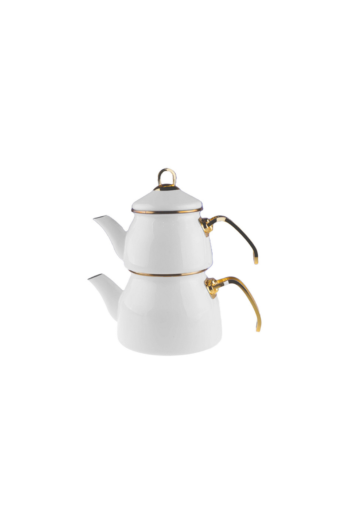 Akgül Piramit Emaye Çaydanlık – Beyaz, Altın Detaylı Şık ve Dayanıklı Tasarım