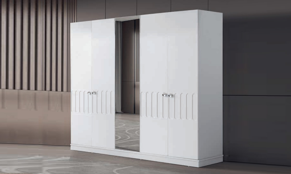 Aris 5 Kapılı Aynalı MDF Gardırop – Beyaz CNC İşlemeli Modern Dolap