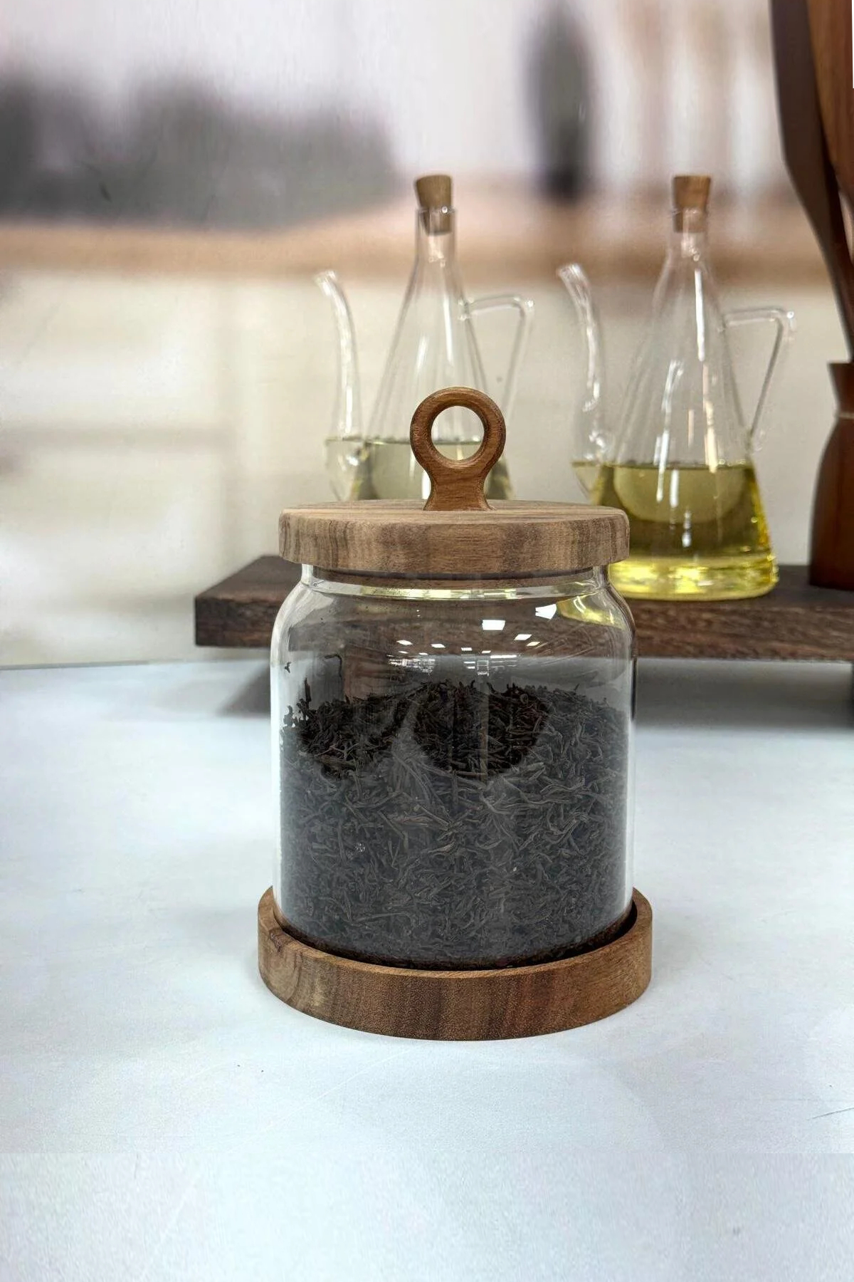 • Şık Tasarım Detayları: Kavanozun cam tabanının oturduğu ahşap yuvarlak altlık, ürüne dekoratif bir görünüm katarken, üst kapaktaki halka tutacak pratik açma-kapama kolaylığı sunar.
