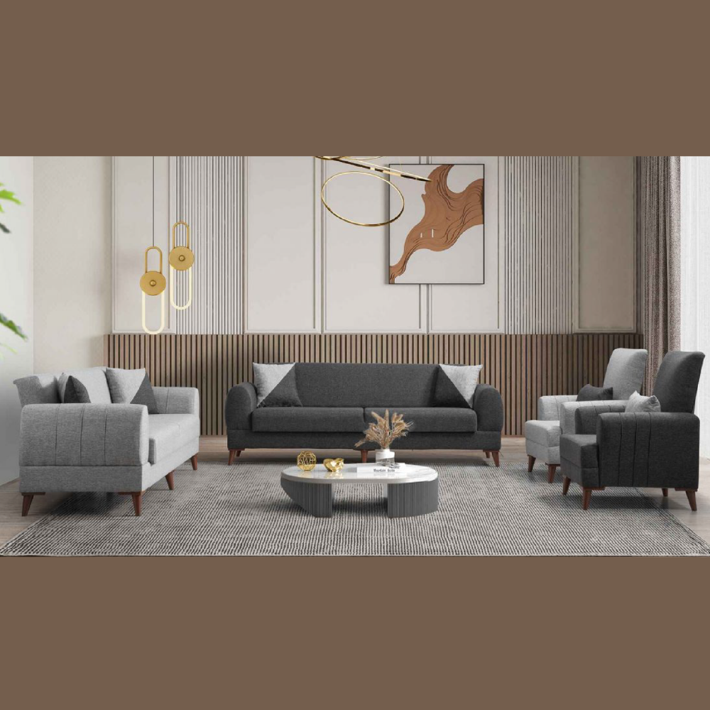 Royal Koltuk Takımı Konforu: Gri ve antrasit tonlarındaki kumaş kombinasyonu leke tutmayan ve kolay temizlenebilen yapıdadır. Yüksek ayak tasarımı sayesinde robot süpürge kullanımına uygundur.