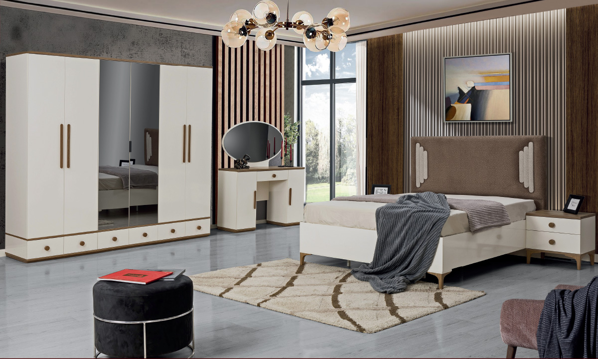 Aynalı ve Çekmeceli Gardırop: Takımın geniş ve altı kapaklı gardırobu, sade ve zarif bir tasarıma sahiptir. Orta kısımdaki iki adet tam boy ayna, odaya derinlik ve ferahlık katarken, krem kapaklarda kullanılan uzun, ince ve ahşap/gold detaylı kulplar modern bir vurgu yapar. Gardırobun alt kısmında boydan boya uzanan çekmeceler, ekstra depolama alanı sunarak düzeni destekler.