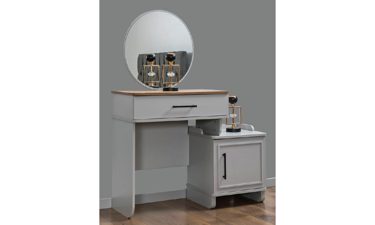 Duru Modern Gri Şifonyer | Yuvarlak Aynalı Makyaj Masası ve Kapaklı Depolama Ünitesi