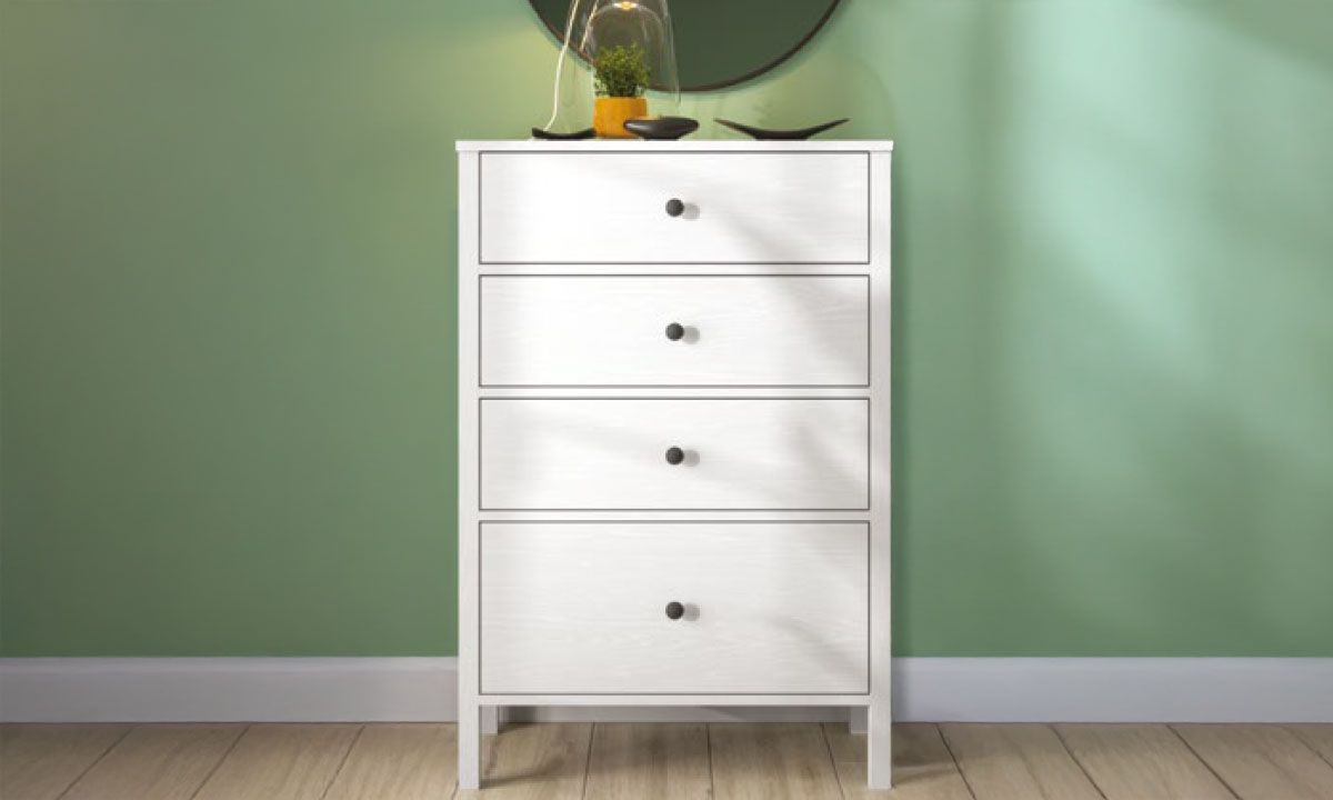 “Helen Dikey Şifonyer – 4 Çekmeceli, Modern Beyaz, Siyah Yuvarlak Kulplu, Kompakt Tasarım” için yorum yapan ilk kişi siz olun