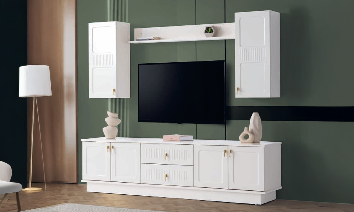 Estetik Konsol: Geometrik desenli kapak detayları ve gold rengi zarif kulpları ile hem geniş bir depolama alanı sunar hem de dekoratif bir şıklık sağlar.