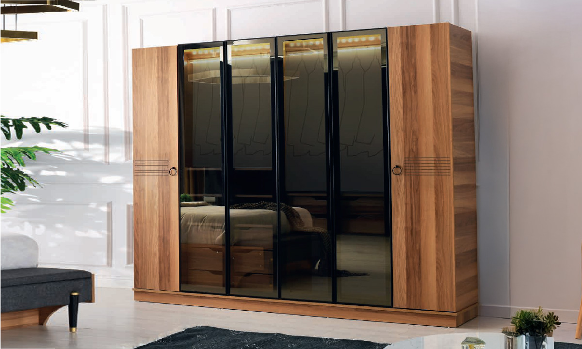 Reflekte Camlı Gardırop: Dolabın orta kısmındaki 4 kapakta kullanılan füme reflekte cam ve sensörlü iç LED aydınlatma, kıyafetlerinizi şık bir vitrin gibi sergiler.