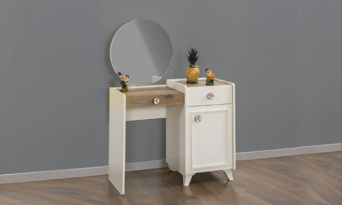 Irmak Minimal Şifonyer | Yuvarlak Aynalı Makyaj Masası ve Dolaplı Komodin Ünitesi