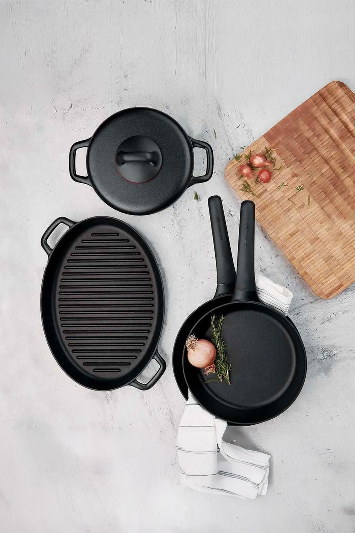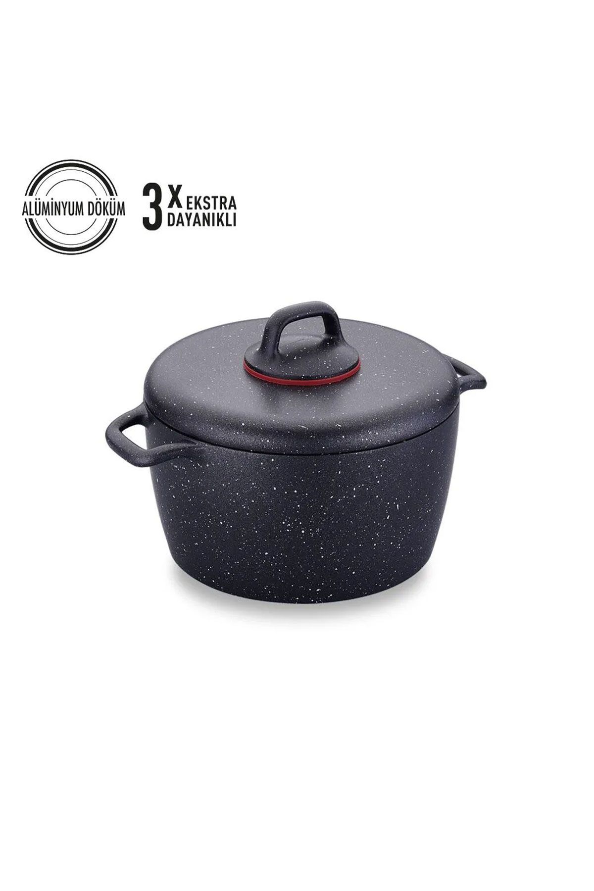 - Geri dönüşümlü, tamamen doğal malzemeden, çevre dostu teknoloji ile üretilen volkanit çizilmeye karşı ekstra dirençli volkanit görünümlü PTFE kaplama ve yüksek ısıya dayanıklı silikon dış kaplama ile çok az yağ kullanarak lezzetli yemekler yapar.