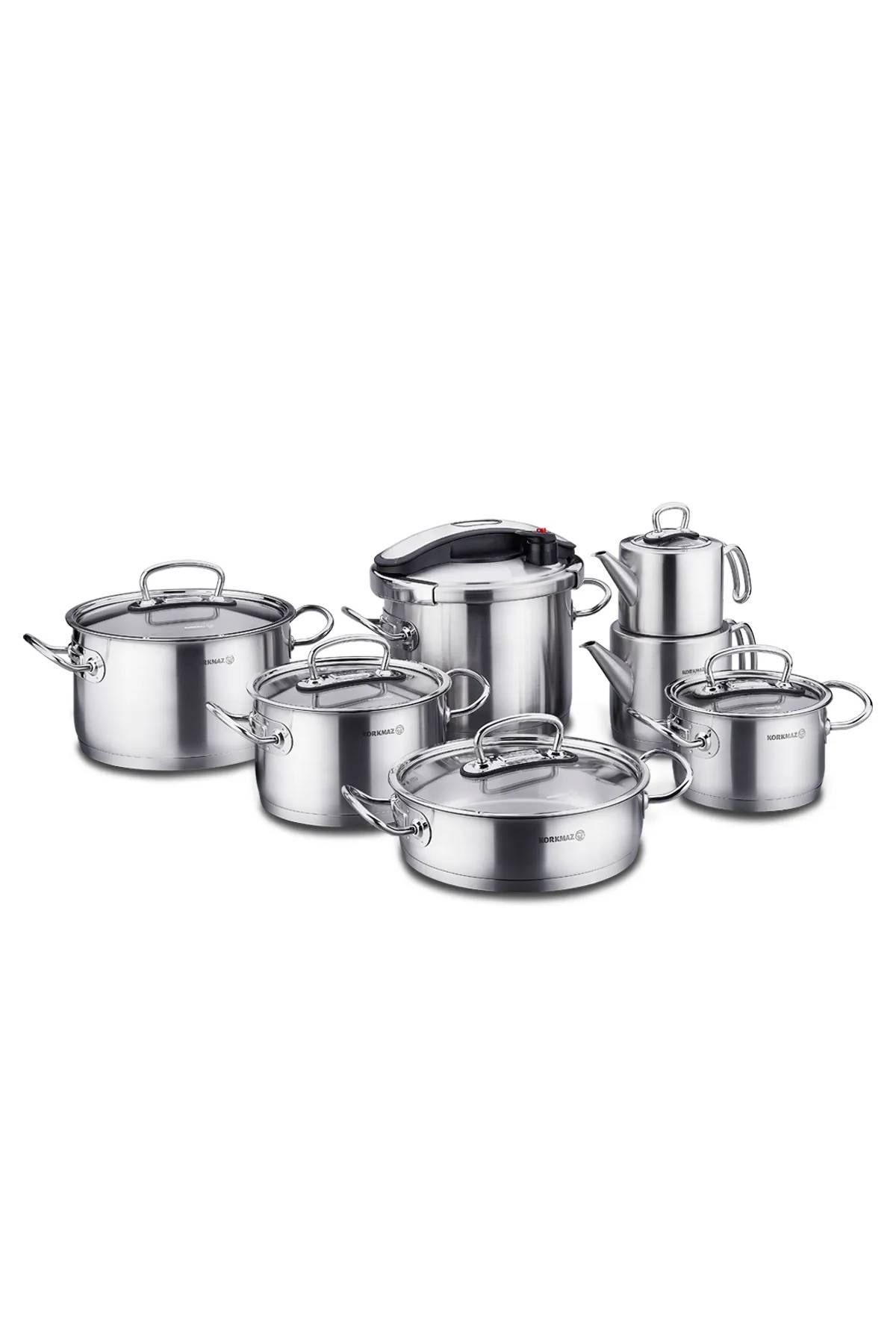 Korkmaz A1757 Proline 14 Parça Hiper Set – Paslanmaz Çelik, Düdüklü Tencere ve Çaydanlık Dahil, Profesyonel Mutfak Seti