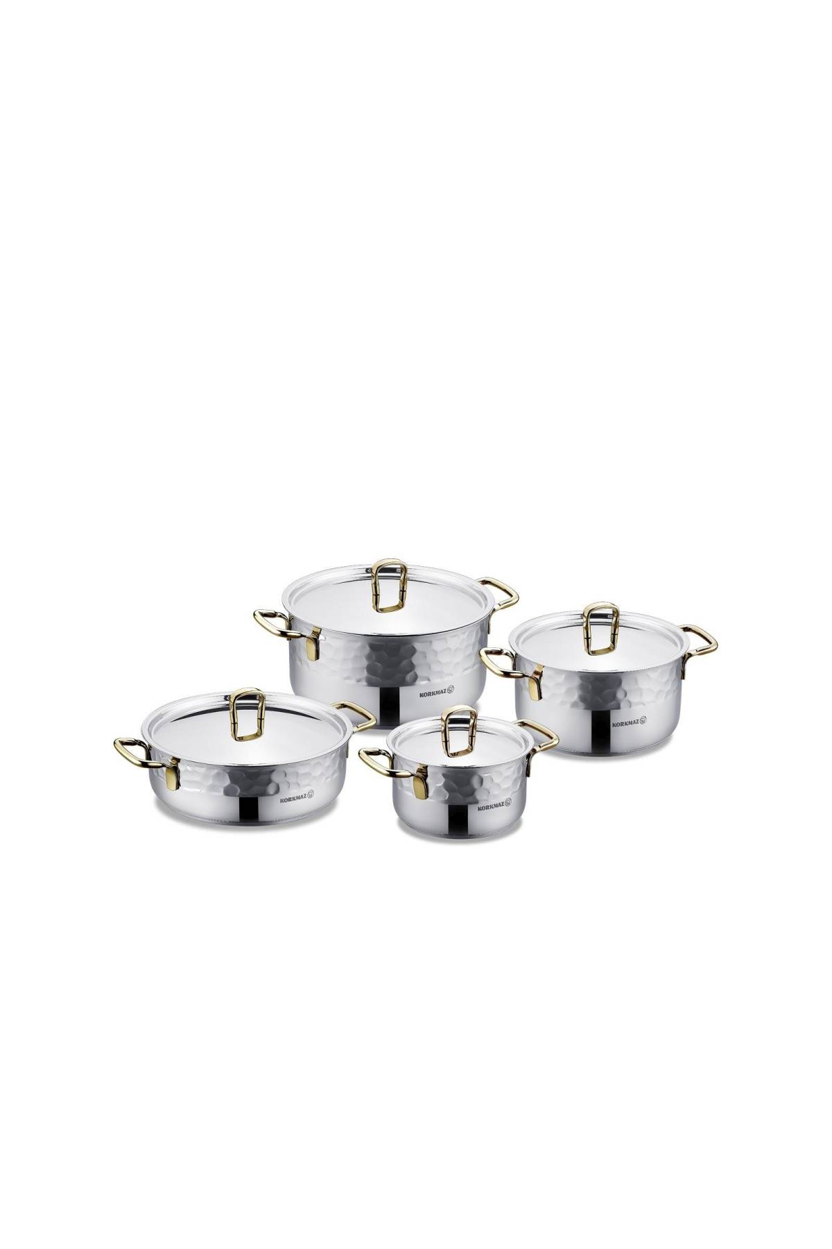 Korkmaz A1963-2 Erna 8 Parça Tencere Seti – Gold, 18/10 Paslanmaz Çelik, Dövme Görünümlü Gövde, İndüksiyon Uyumlu ve Isıya Dayanıklı Altın Detaylı Modern Pişirme Seti