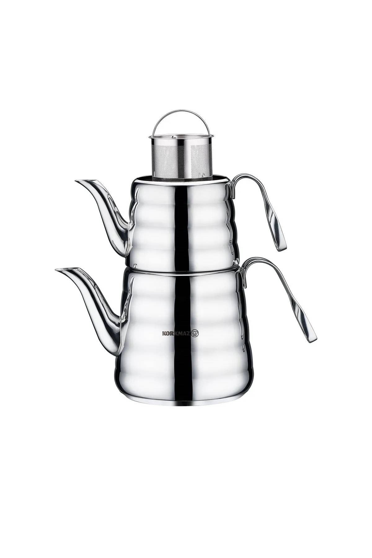 Korkmaz Petra Çaydanlık Takımı, çay keyfinizi profesyonel bir seviyeye taşıyan estetik ve dayanıklı bir tasarıma sahiptir. 18/10 Cr-Ni paslanmaz çelikten üretilen gövdesi, parlaklığını uzun yıllar korurken sağlıklı bir kullanım sunar. Setin en dikkat çekici özelliği olan üst demlik içindeki kendinden süzgeç sistemi, ek bir süzgece ihtiyaç duymadan pürüzsüz ve berrak çaylar demlemenize olanak tanır. Isıyı homojen bir şekilde dağıtan özel kapsül tabanı sayesinde enerji tasarrufu sağlarken, ergonomik çelik sapları güvenli ve konforlu bir kullanım sunar.