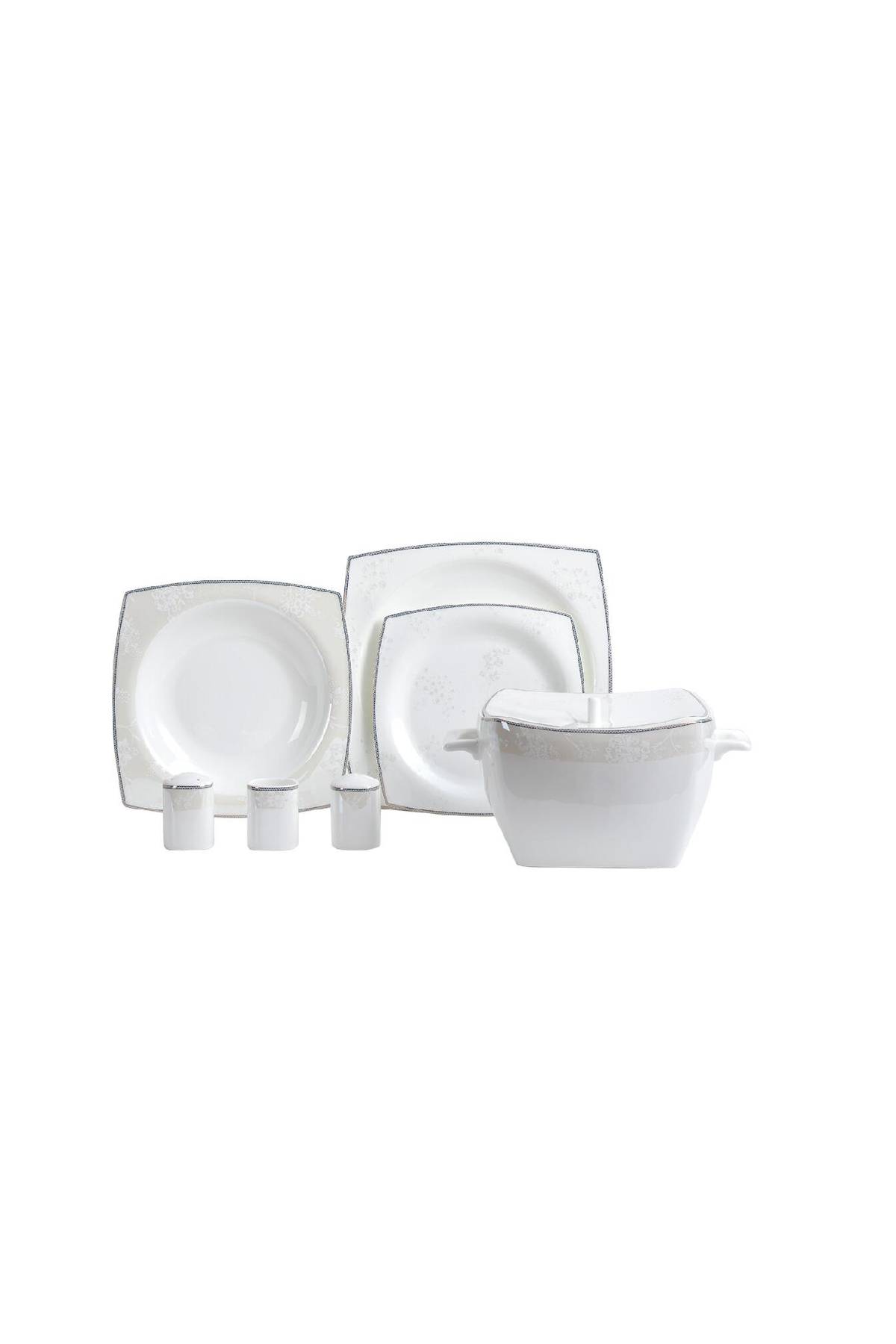 Bütünsel Sunum: Seti tamamlayan şık kare formlu kapaklı çorba kasesi ve uyumlu tuzluk-biberlik tasarımları ile masada görsel bir bütünlük sağlanır.