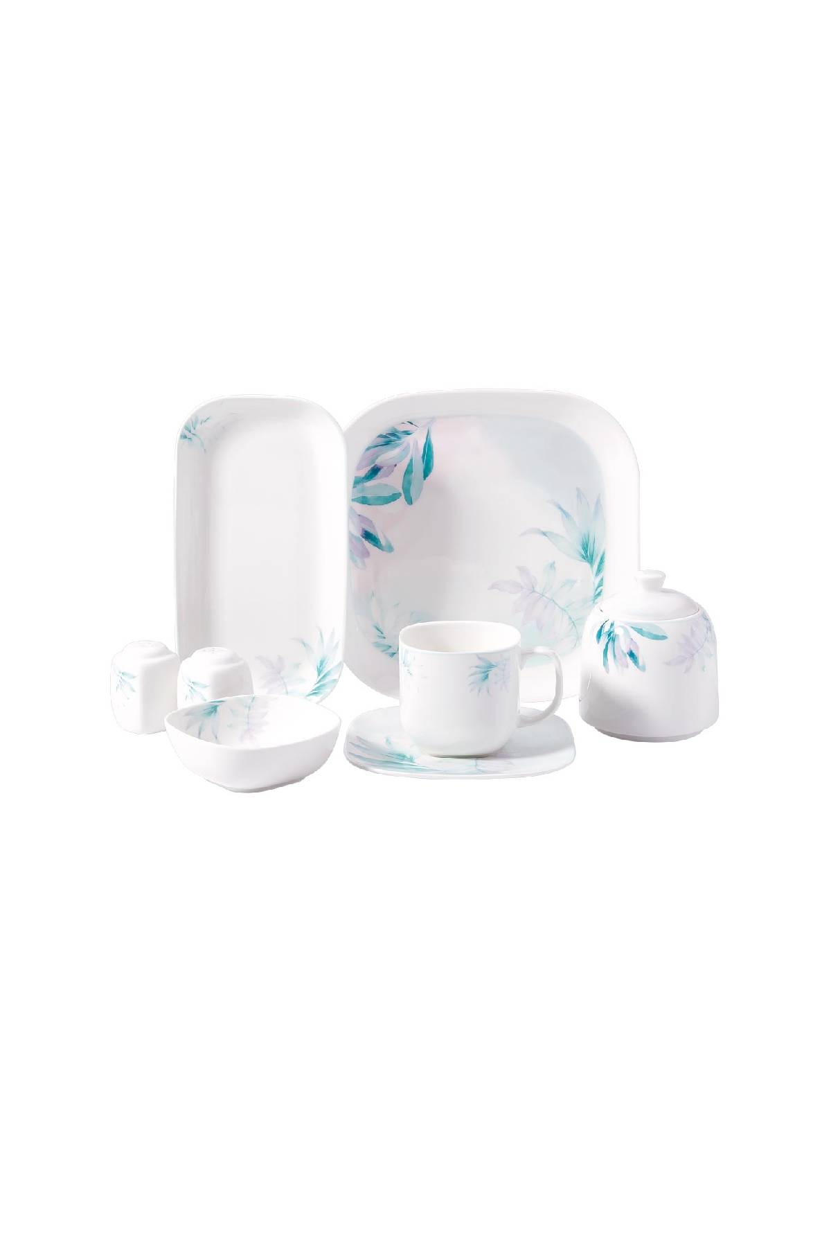 Korkmaz A8694 Kappa Collection 28 Parça Kahvaltı Takımı – 6 Kişilik, Kare Formlu Porselen, Suluboya Yaprak Desenli Modern ve Şık Sunum Seti