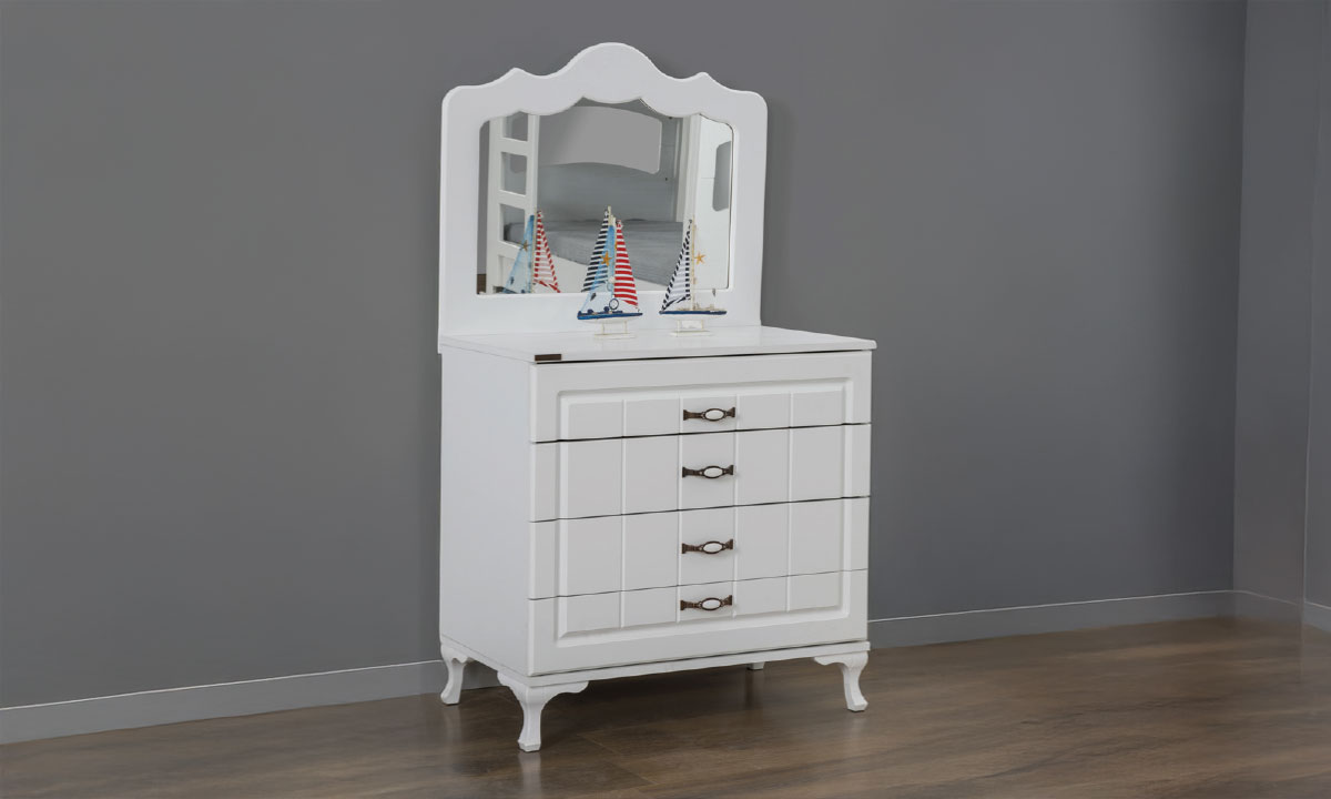Kupon Klasik Beyaz Şifonyer | Oymalı Aynalı 4 Çekmeceli Lake Görünümlü Komodin