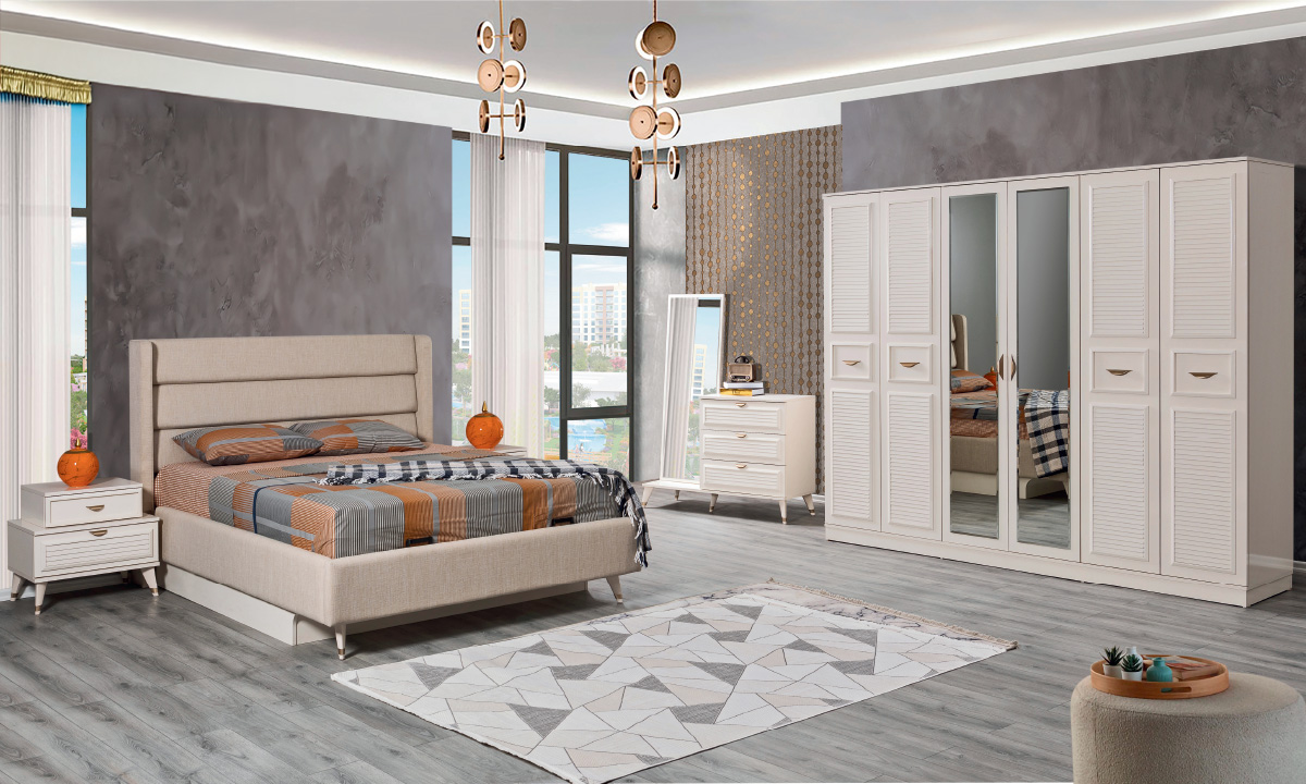 Diamond Yatak Odası Takımı, country (kır evi) stilinin lamelli (panjur) detaylarını modern ve sade çizgilerle birleştirerek yatak odanıza huzurlu, estetik ve fonksiyonel bir atmosfer katıyor. Yüksek kalitede ve sağlam MDF malzeme kullanılarak üretilen bu takım, krem/beyaz lake (veya mat) görünümü ve bej kumaşın sıcak uyumuyla dikkat çeker.