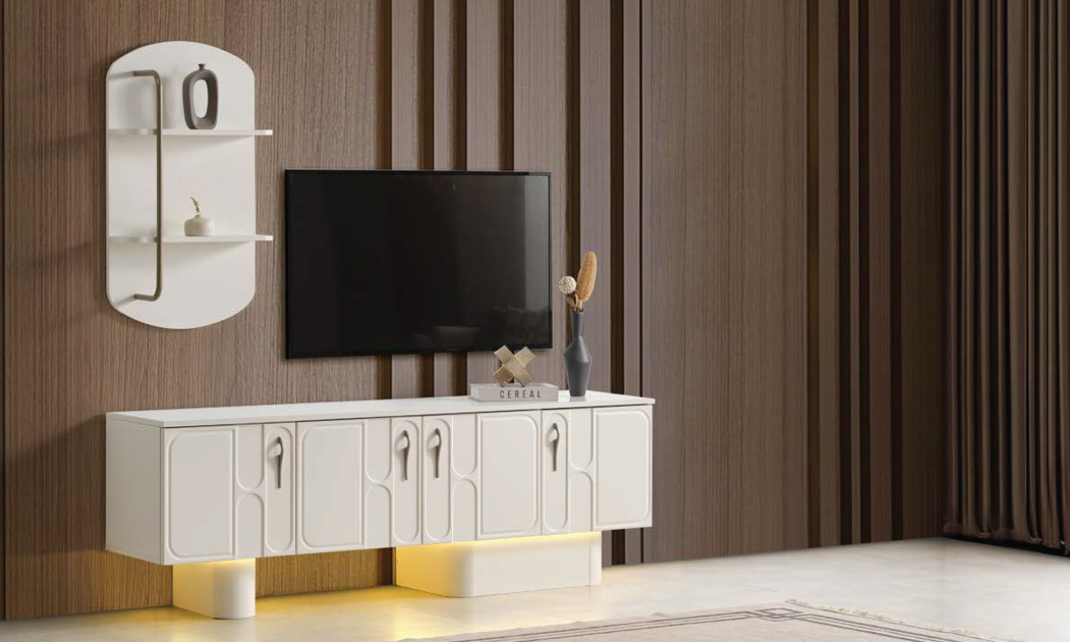 Kavisli Çerçeveli Işıklı Konsol: Konsol, takımın en özgün ve detaylı parçasıdır. Kapaklarında yer alan uzun, dikey ve kavisli çerçeve detayları (kabartma/frezeli), konsola sanatsal bir derinlik ve hareket katar. Kavisli formdaki minimalist metal kulplar, tasarımın akıcılığını pekiştirir. Konsolun kaideli yapısı ve altındaki gizli LED ambiyans aydınlatması, mobilyaya modern bir ışıltı ve lüks bir atmosfer yaratır.
