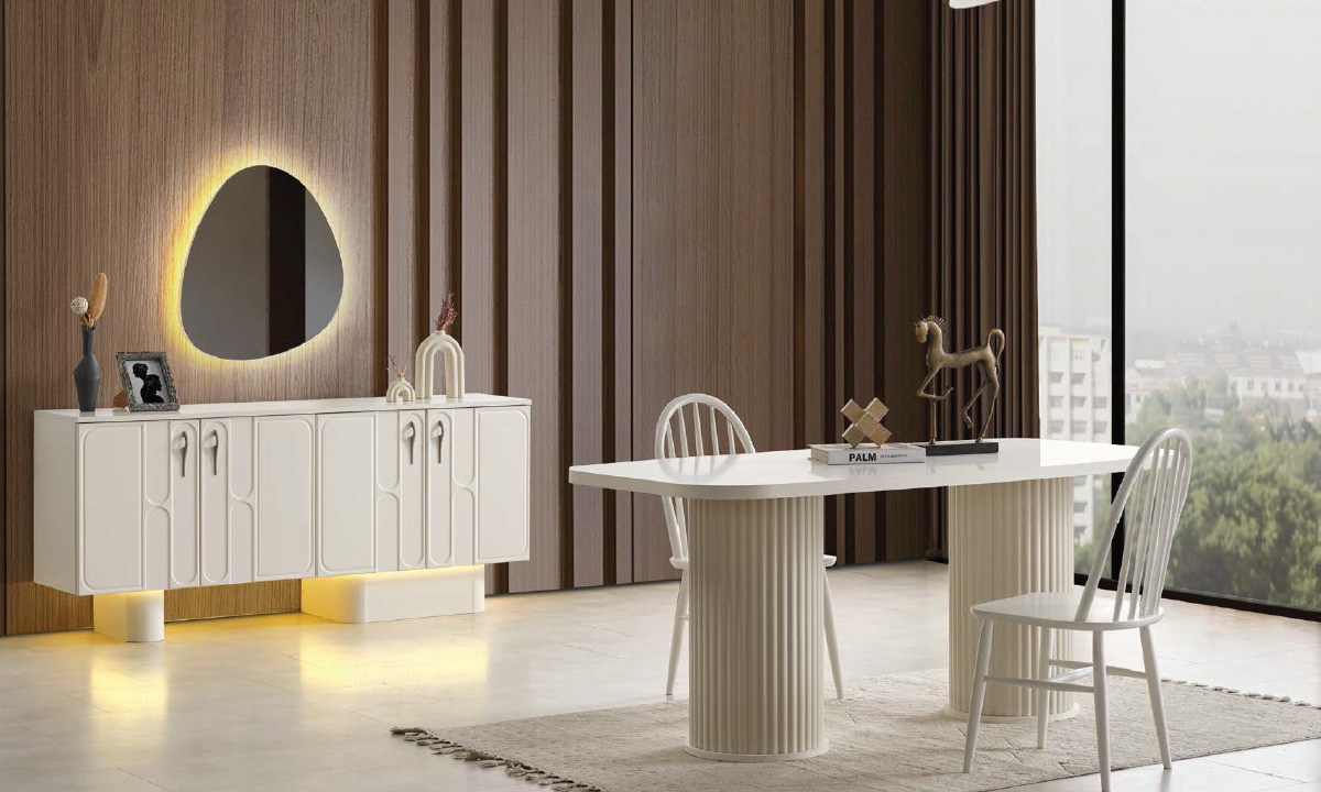 MDF Garda Yemek Odası Takımı (Sandalyesiz) | Flüt Ayaklı Masa, Kavisli Çerçeveli Konsol ve Işıklı Asimetrik Ayna
