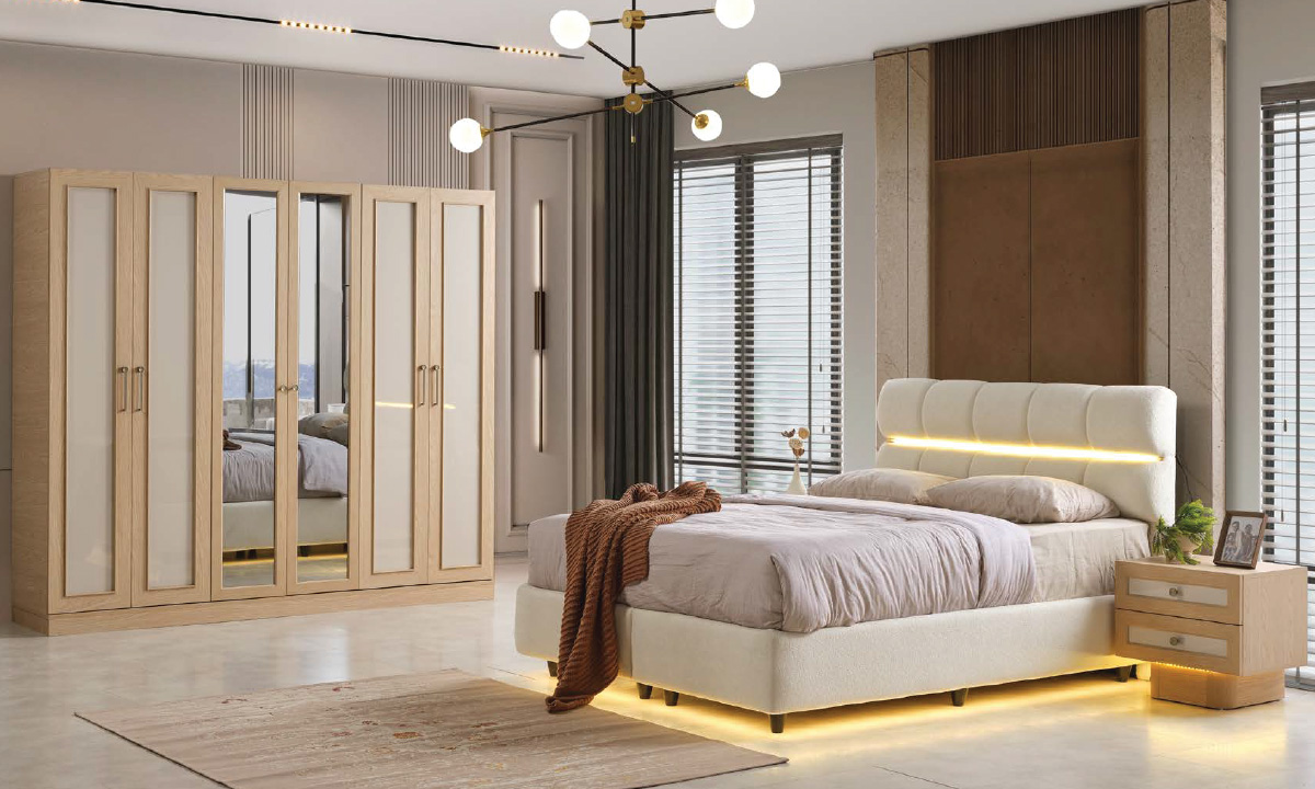 MDF Helis Yatak Odası Takımı, doğal meşe/kayın tonlarındaki ahşabın sıcaklığını, modern krem paneller ve teknolojik aydınlatma detaylarıyla birleştiriyor. Yüksek kaliteli ve dayanıklı MDF iskelet üzerine kurulu bu takım, yatak odanıza ferah, aydınlık ve huzurlu bir hava katmak için tasarlandı.