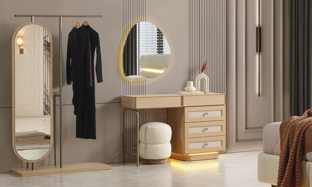 MDF Lumina Yatak Odası Takımı | Beyaz Lake Görünümlü, Oval Aynalı ve LED Işıklı Başlık