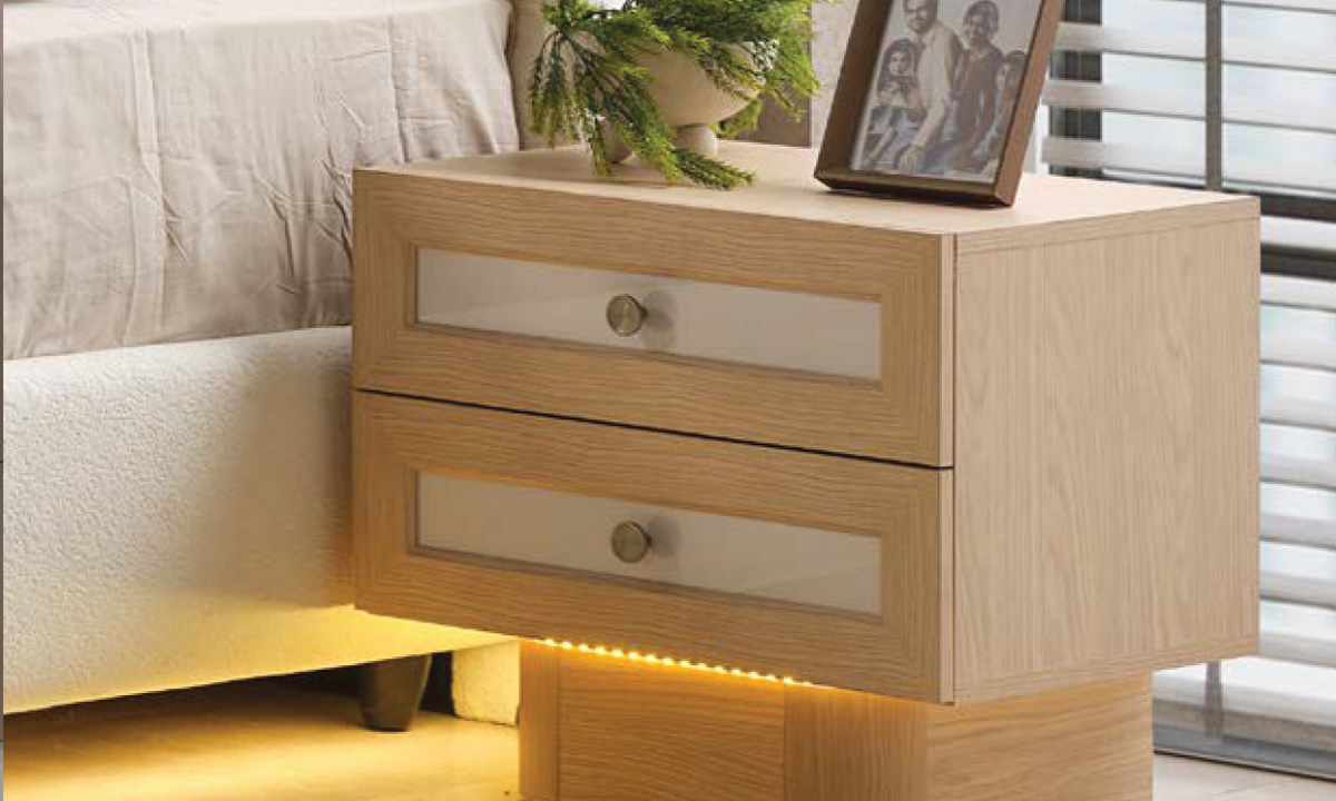 Uyumlu Komodin: Yatağın yanındaki komodinler, gardıropla uyumlu naturel ahşap tonunda ve sade bir tasarıma sahiptir. İki geniş çekmecesi, yatak başı eşyalarınızı düzenli tutarken, üst çekmece altındaki ince aydınlatma detayı şık bir vurgu yapar.