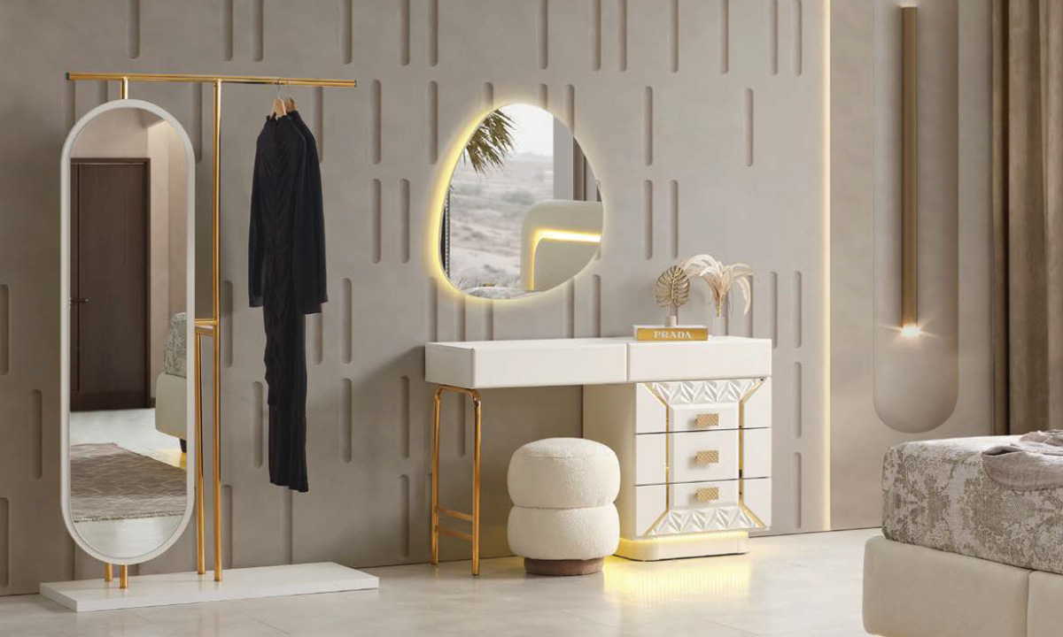 Sanatsal Gardırop Tasarımı: Takımın altı kapaklı gardırobu, merkezde yer alan geometrik kabartma desenler ve altın rengi zarif çerçevelerle bir sanat eserini andırır. Ayna ve kabartma desenli panellerin dengeli kullanımı, hem depolama çözümünü zenginleştirir hem de odaya derinlik katar. Altın detaylı kulp seçimi, takımın lüks temasını pekiştirir.