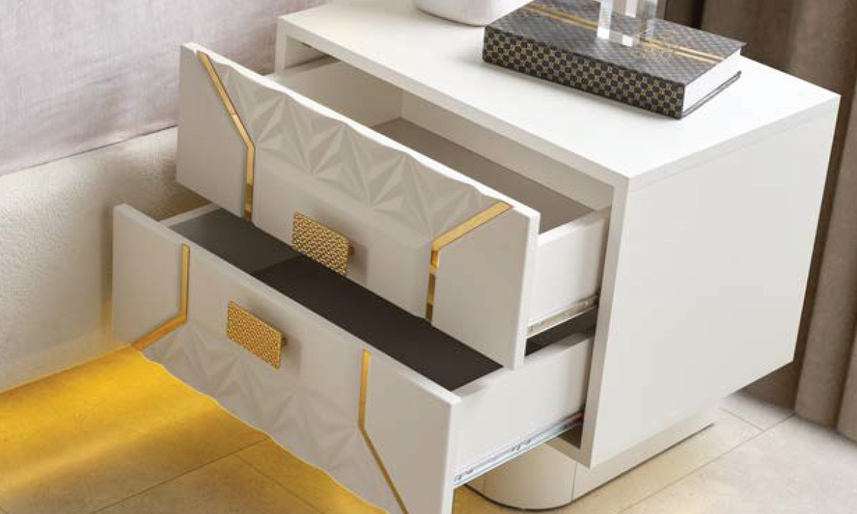 Şık Komodin: Yatak yanlarında bulunan komodinler, gardıropla uyumlu geometrik desenli ön yüzeylere ve altın rengi detaylara sahiptir. Geniş çekmeceleri, yatak odası aksesuarlarınız için pratik ve düzenli bir saklama alanı sağlar.