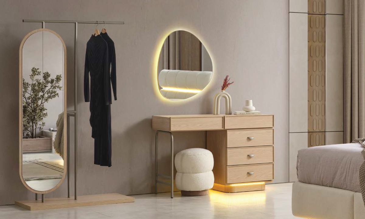 Ahşap ve Aynalı Gardırop: Takımın geniş ve altı kapaklı gardırobu, düz ve sade doğal ahşap (meşe/kayın) görünümlü paneller ve ortadaki geniş boy aynalı paneller ile tasarlanmıştır. Aynaların ve ahşap panellerin dengeli kullanımı, odaya ferahlık ve doğal bir şıklık katar. Gardırobun minimalist tasarımı, kulpların sade dikey çizgileriyle pekiştirilmiştir.