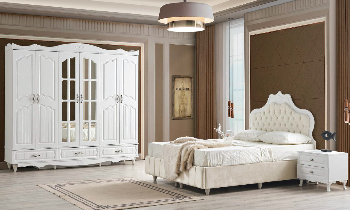 MDF Muğla Yatak Odası Takımı | Neoklasik Stil, Kapitoneli Taç Başlık ve Aynalı Lüks Gardırop