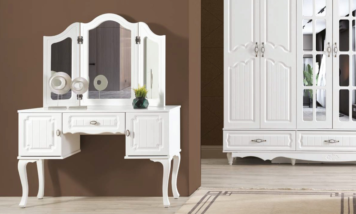 Neoklasik ve Fonksiyonel Gardırop: Geniş ve altı kapaklı gardırop, üst kısmındaki zarif kavis ve taç detayıyla başlığın stilini tamamlar. Kapaklarda yer alan sade frezeli/kabartma desenler ve boy aynalı orta paneller, gardıroba estetik bir derinlik katar. Alt kısımda bulunan dört adet çekmece, ekstra depolama alanı sunarak düzeni kolaylaştırır. Oymalı torna ayaklar, takımın neoklasik stilini pekiştirir.