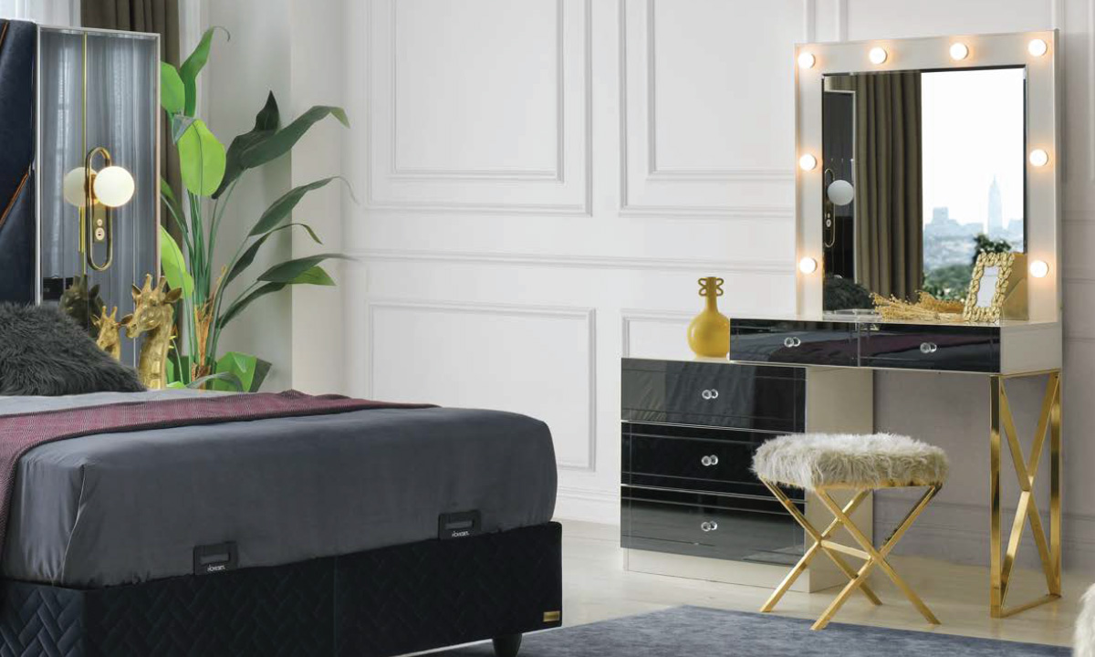 Lüks Komodin: Takıma ait komodin, metal (gold) ayak ve çerçeve detaylarıyla karyoladaki lüks temayı sürdürür. Ayna veya cam yüzeyler ve çekmeceler, yatak başı aksesuarlarınız için zarif bir saklama çözümü sunar.