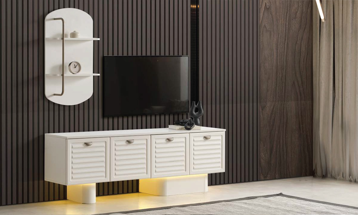 Panjur/Fitil Desenli Işıklı Konsol: Konsol, yalın gövdesine hareket katan yatay panjur (veya ince fitil) desenli kapak detaylarıyla öne çıkar. Kapaklar üzerindeki sade, silindir formlu minimalist kulplar, tasarımın sadeliğini korur. Konsolun zeminden yüksek ve kaideli yapısı ile altındaki gizli LED ambiyans aydınlatması, mobilyaya modern bir ışıltı ve hafiflik hissi verir.