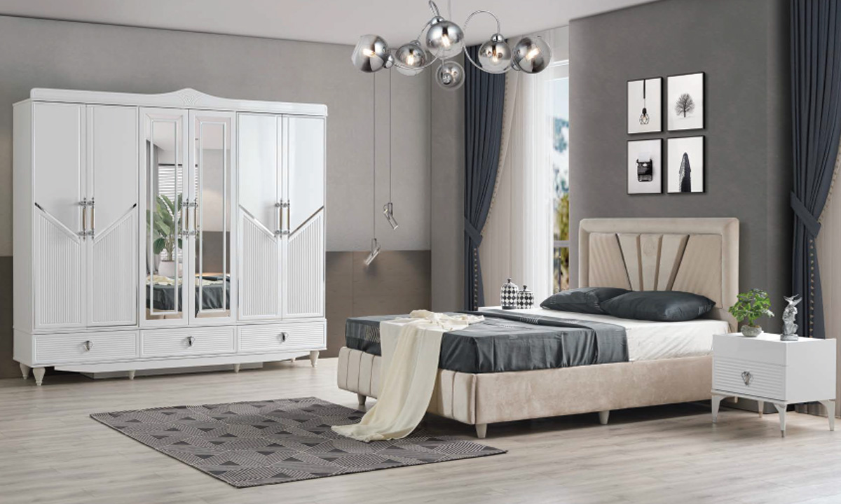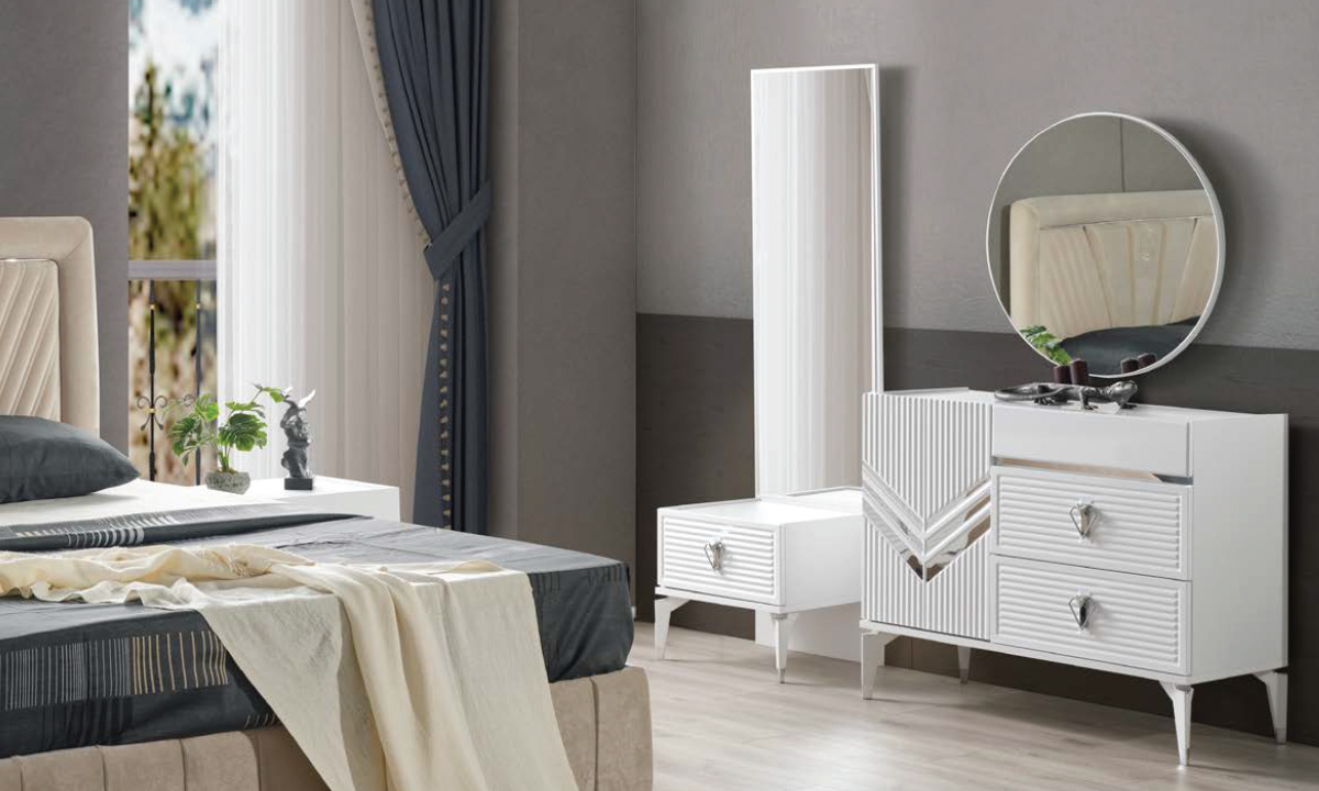 MDF Sakarya Yatak Odası Takımı, klasikleşmiş zarif çizgileri modern detaylarla harmanlayarak yatak odanıza huzurlu ve asil bir atmosfer katıyor. Yüksek kalitede ve sağlam MDF malzeme kullanılarak üretilen bu takım, parlak beyaz lake (veya mat) görünümüyle uzun ömürlü ve şık bir kullanım sunar.