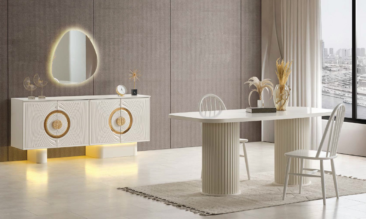 MDF Seyhan Yemek Odası Takımı (Sandalyesiz) | Yuvarlak Masa, Flüt Ayak ve Kemer Desenli Konsol