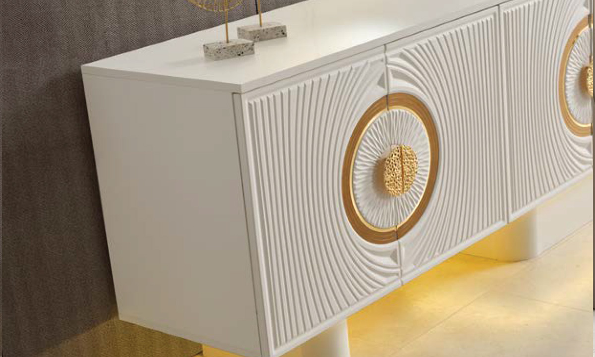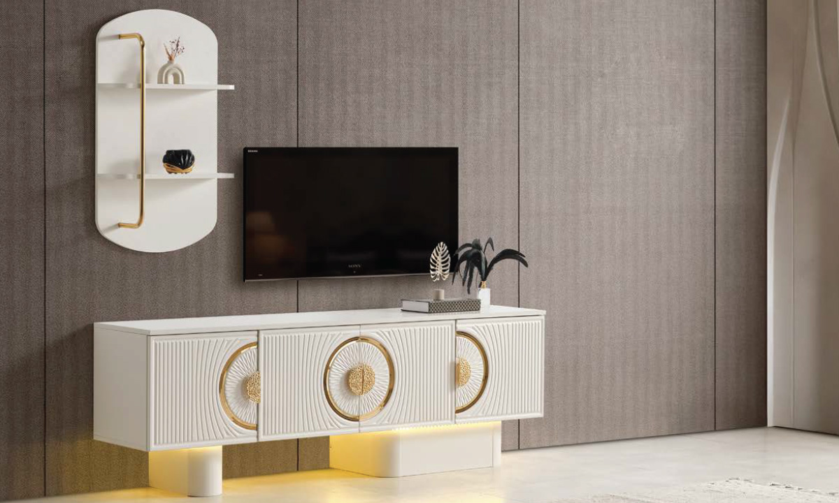 Göz Kamaştırıcı Konsol: Konsol, takımın en gösterişli parçasıdır. Kapaklardaki dikey kabartma desenleri, merkezde yer alan büyük, gold (altın) detaylı dairesel kulplar ile tamamlanır. Konsolun altındaki gizli LED aydınlatma, mekana sıcak bir ambiyans katarak lüks dokunuşu pekiştirir.
