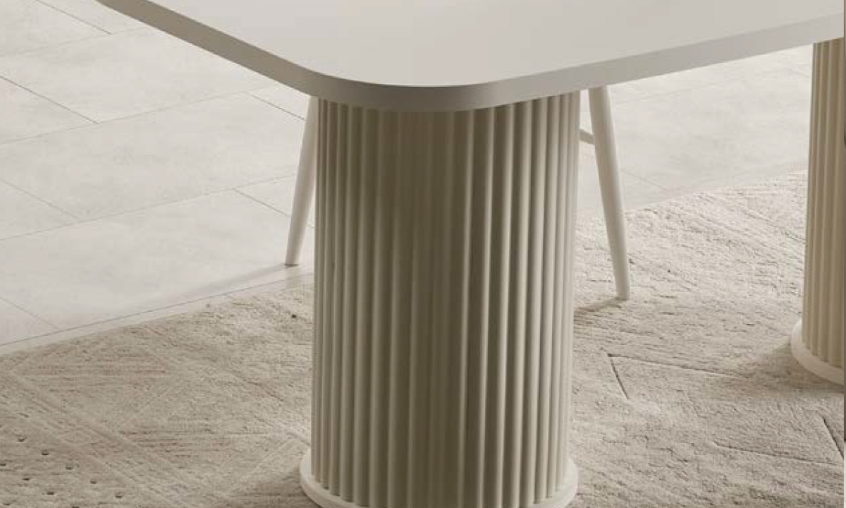 Heykelsi Açılır Yemek Masası: Masanın en çarpıcı yanı, dikey flüt (fitilli/lambri) desenli silindir formundaki heykelsi ayaklarıdır. Ovalleştirilmiş kenarlara sahip masa tablası, zarif bir görünüm sunarken, pratik açılır mekanizması sayesinde kalabalık misafirleriniz için kolayca genişler.