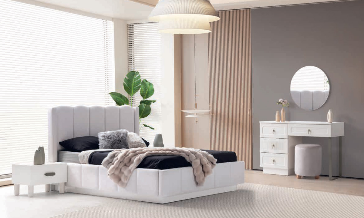 • Panjur (Louver) Tasarım: Gardırop kapaklarındaki yatay şeritli panjur dokusu, takıma “Coastal Modern” (Sahil evi şıklığı) havası katarak sıradan düz beyaz mobilyalardan ayrışır.