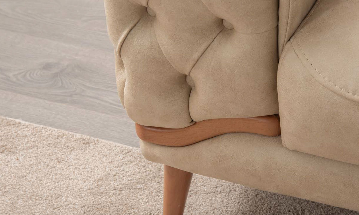 Kanepenin gövdesini alt kısımdan çevreleyen estetik ahşap detaylar, tasarımın bütünlüğünü sağlarken ürüne doğal bir sıcaklık katar. Nubuk görünümlü, silinebilir yüksek kaliteli kumaşı, yumuşak dokusuyla konforlu bir oturum deneyimi sunarken leke tutmayan yapısıyla günlük kullanımda büyük kolaylık sağlar. Yüksek yoğunluklu (32 DNS) sünger kullanılan oturum minderi ve ergonomik sırt açısı, uzun süreli dinlenme anlarınızda vücudunuzu destekler.