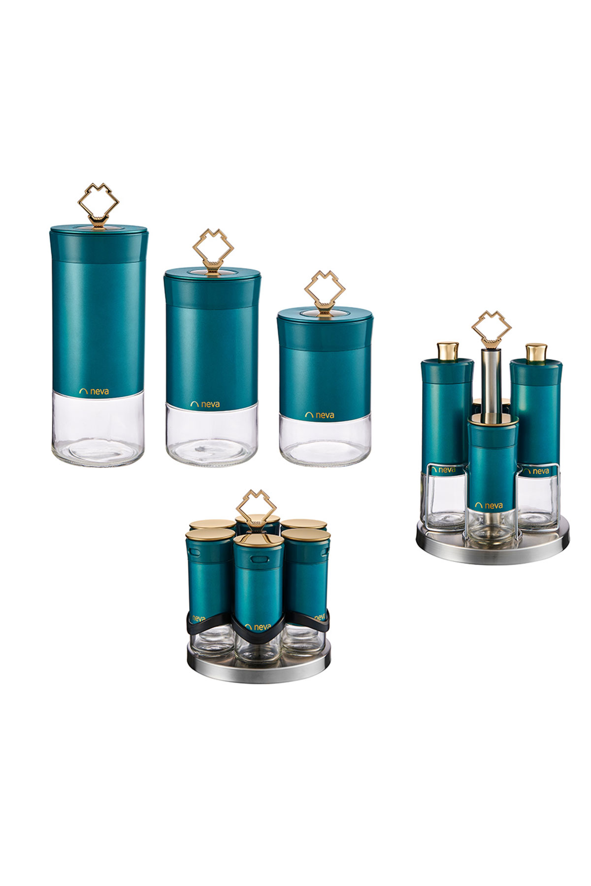 3 Boy Kavanoz, 6’lı Dönen Standlı Baharatlık, 4’lü Dönen Standlı Yağlık & Sirkelik